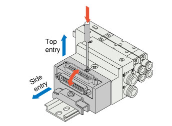 The connector entry direction can be changed from the top to the side by simply pressing the manual release button. It is not necessary to use the manual release button when switching from the side to the top.