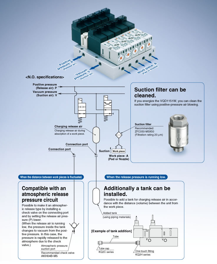 ■N.O. (Vacuum absorption type when de-energized) and N.C. (Vacuum shutoff type when de-energized) specifications are available.