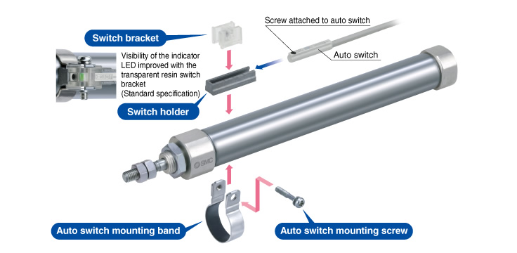 Fine adjustment of the auto switch set position can be performed by loosening the auto switch attached screw. Operability improved compared with the conventional auto switch set position adjustment, where the complete switch mounting band requires loosening.