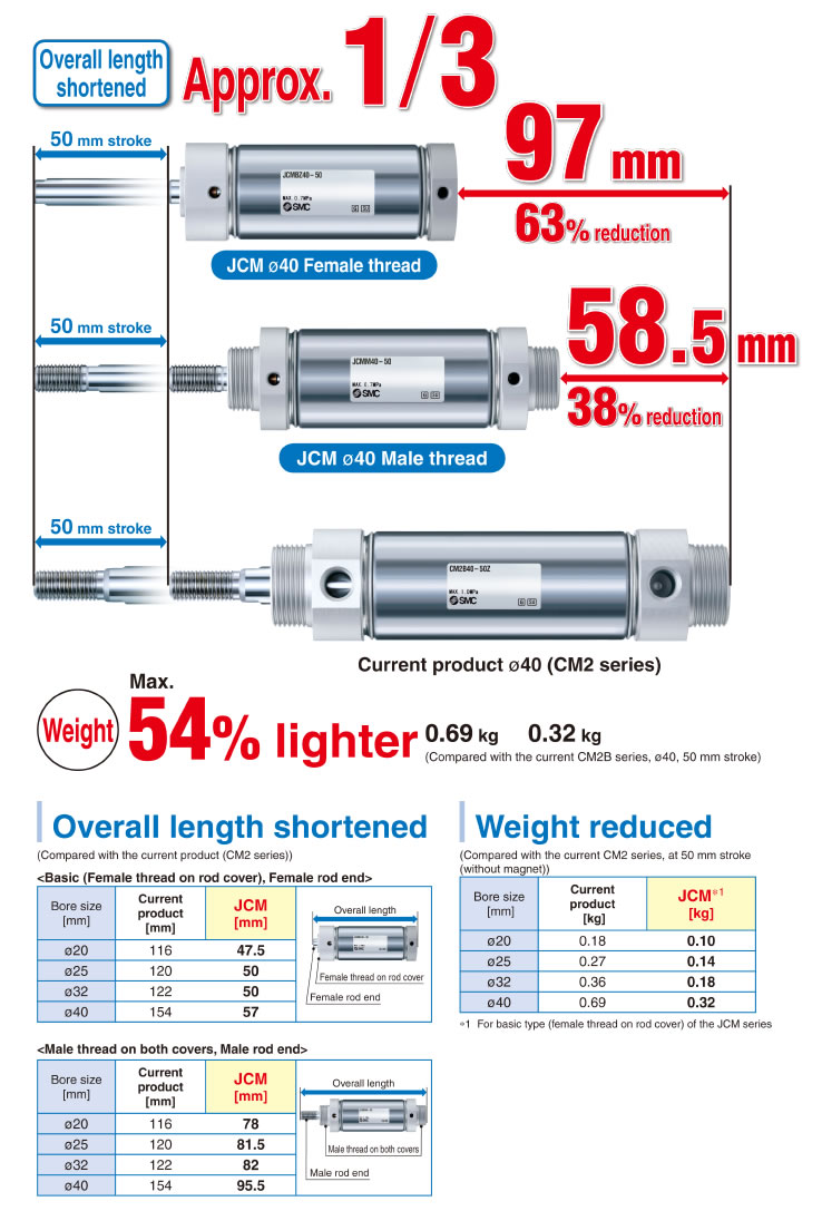 (Compared with the current CM2 series, at 50 mm stroke (without magnet))