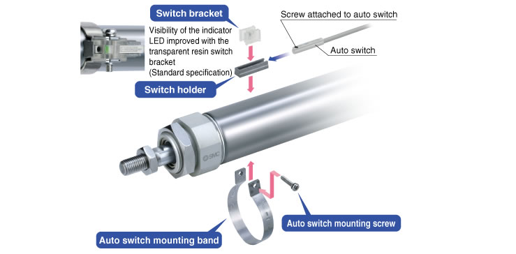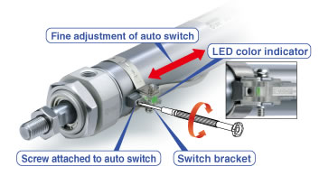 Fine adjustment of the auto switch set position can be performed by loosening the auto switch attached screw. Operability improved compared with the conventional auto switch set position adjustment, where the complete switch mounting band requires loosening.