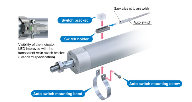 Fine adjustment of the auto switch set position can be performed by loosening the auto switch attached screw. Operability improved compared with the conventional auto switch set position adjustment, where the complete switch mounting band requires loosening.
