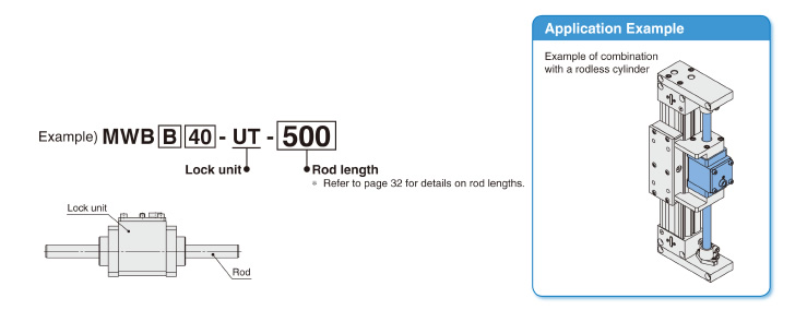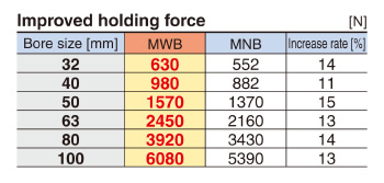 | 標(biāo)準(zhǔn)型 | MWB | 單桿雙作用 | 32,40,50,63 | 排氣鎖緊 |