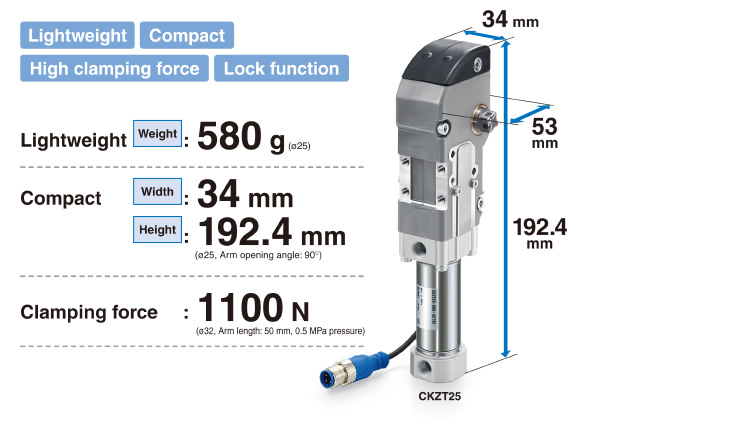 SMC氣缸CKZT25-X2797/X2798□強力夾緊缸/緊湊型重量輕 質(zhì)量:580g體積小 寬:34mm、高:192.4mm (臂開度90o)夾緊力:660N (臂長50mm、0.5MPa時)可通過切換開關(guān)選擇增力和鎖緊功能。耐噴濺。帶有應(yīng)對焊接磁場的接近開關(guān)。可選擇帶手動操作用的手柄。