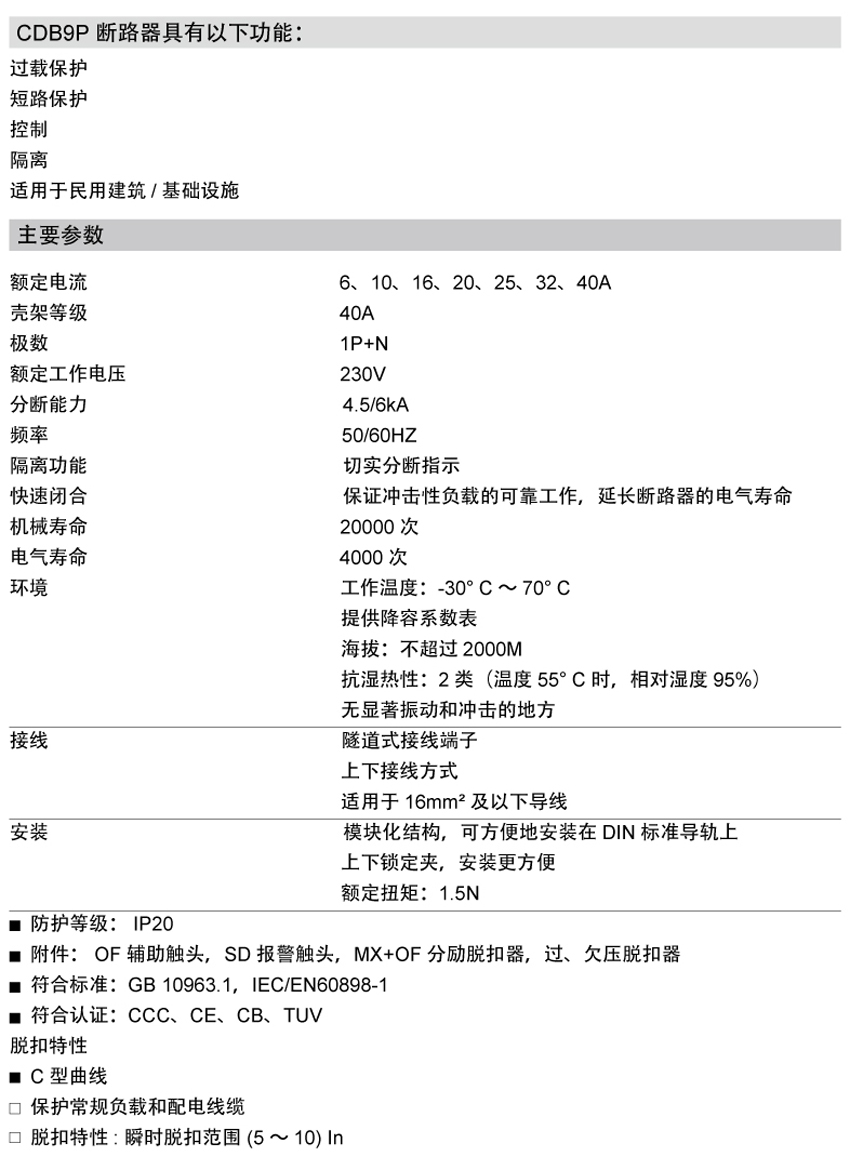 DELIXI德力西CDB9P 相線+中性線小型斷路器 產(chǎn)品參數(shù):