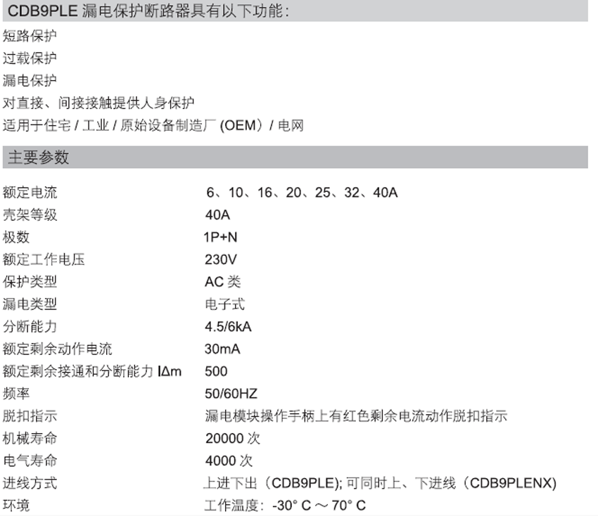 DELIXI德力西CDB9PLE 相線+中性線漏電保護斷路器 產(chǎn)品參數(shù):