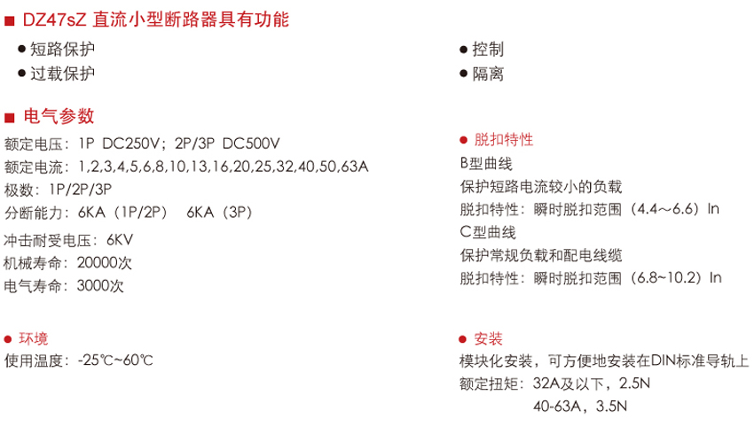 DELIXI德力西DZ47sZ 直流塑料外殼式斷路器 產(chǎn)品參數(shù):