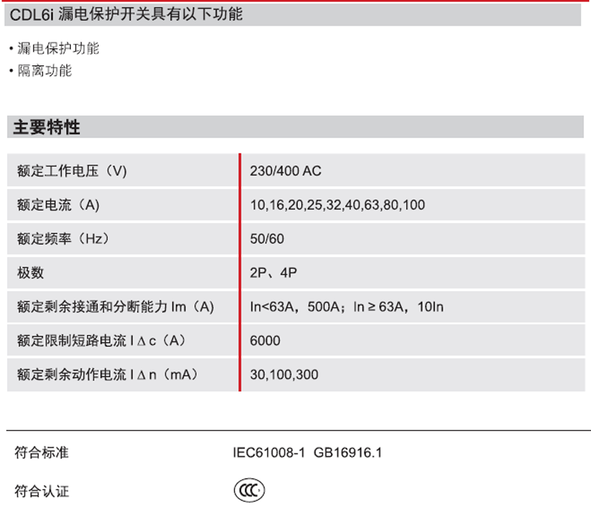 DELIXI德力西CDL6i電磁式漏電保護(hù)開(kāi)關(guān) 產(chǎn)品參數(shù):