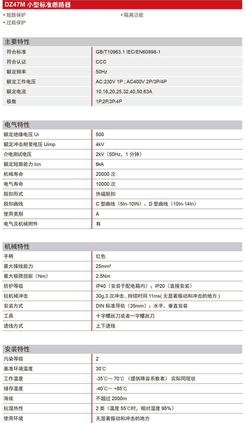 DELIXI德力西DZ47M 小型標(biāo)準(zhǔn)斷路器 產(chǎn)品參數(shù):