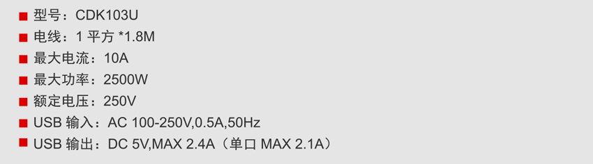 DELIXI德力西CDK 103U延長線插座(USB新國標(biāo)) 產(chǎn)品參數(shù):