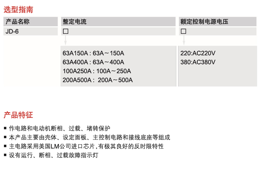 DELIXI德力西JD-6 系列電動(dòng)機(jī)綜合保護(hù)器JD-6 系列電動(dòng)機(jī)綜合保護(hù)器作電路和電動(dòng)機(jī)斷相、過(guò)載、堵轉(zhuǎn)保護(hù) 。 本產(chǎn)品主要由殼體、設(shè)定面板、主控制電路和接線底座等組成,主電路采用美國(guó)LM公司進(jìn)口芯片,有極其良好的反時(shí)限特性,設(shè)有運(yùn)行、斷相、過(guò)載故障指示燈.